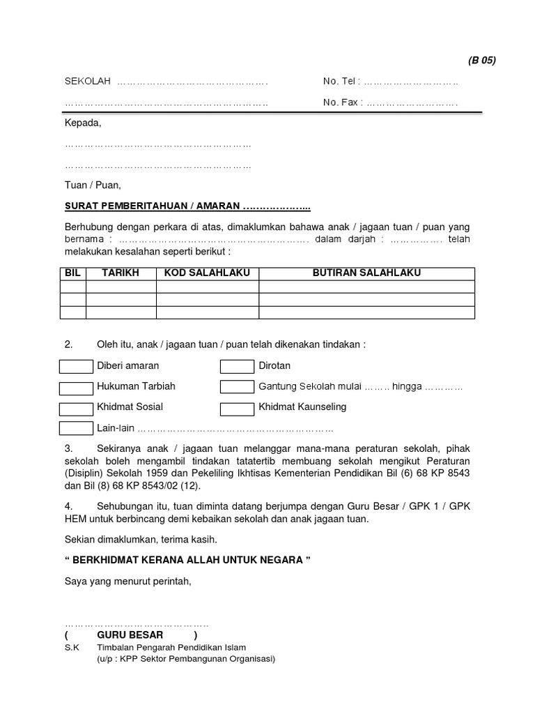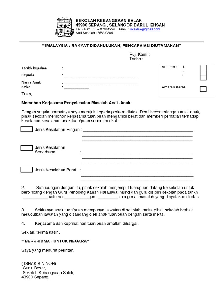 Surat Tidak Hadir Ke Sekolah Kerana Balik Kampung. 4 Apabila telah diisikan maklumat yang diperlukan selengkapnya guru akan mula cetak surat amaran untuk melibatkan salah laku disiplin murid. Abu Bin Bakar No.